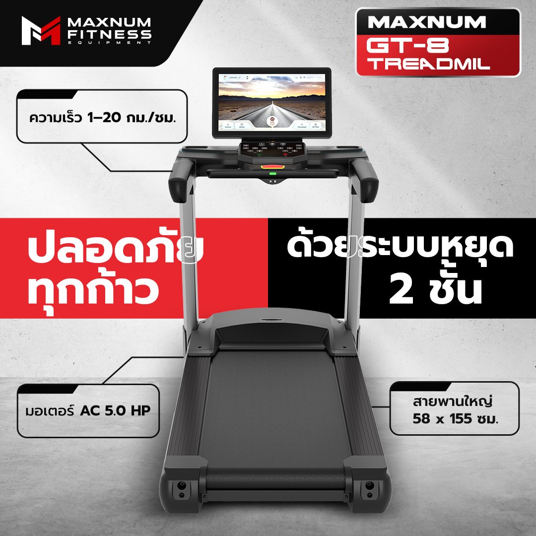 สร้างประสบการณ์การวิ่งแบบเต็มแม็กซ์ ด้วยลู่วิ่งไฟฟ้า ‘Maxnum GT X Max’ - จอสัมผัสขนาดใหญ่ 27 นิ้ว ความละเอียด 1920x1080 Full HD - ช่องเสียบ USB และเชื่อมต่อ Wifi เพื่อความบันเทิง - รองรับ App ออกกำลังกายมากมายทั้งระบบ iOS และ Android - มอเตอร์ AC 6 แรงม้า เสียงเบา แข็งแรง ทนทาน - ปรับความเร็วได้สูงสุด 25 กิโลเมตร/ชั่วโมง - ปรับระดับความชันได้ตั้งแต่ -3 ถึง 18% - รองรับน้ำหนักผู้ใช้งานได้มากถึง 200 กิโลกรัม
